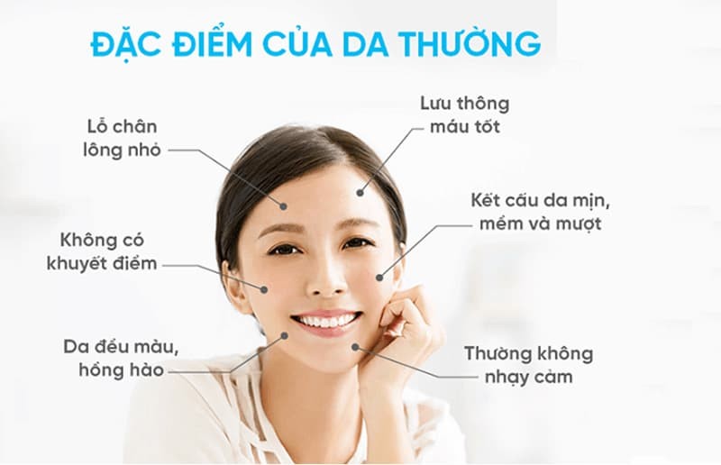 Da thường là loại da không quá nhờn nhưng cũng không bị khô. Với tính chất trên thì rõ ràng da thường là loại da khỏe mạnh và lý tưởng nhất mà các chị em đều mong được sở hữu. Khi chạm tay vào da, chúng ta có thể dễ dàng cảm nhận được độ mềm mượt nhẹ nhàng của da, đặc biệt sau khi rửa mặt xong thì da cũng không có nhiều sự thay đổi. Lớp sừng bên ngoài luôn được giữ ở mức độ ẩm lý tưởng.