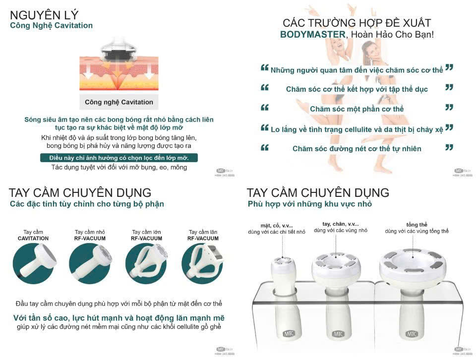 • Tay cầm Cavitation: Tạo ra hiệu quả trong việc phá vỡ mỡ thừa.